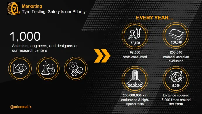 Để cho ra một dòng lốp sử dụng trên thị trường Continental đã trải qua nhiều cuộc thử nghiệm tại Contidrom (Trung tâm nghiên cứu lốp xe hàng đầu của Continental). Ước tính mỗi năm Continental tiến hành hơn 67.000 cuộc thử nghiệm, vượt qua 200.000.000 km để kiểm tra độ bền của lốp, con số này tương ứng với 5.000 vòng xoay quanh trái đất.