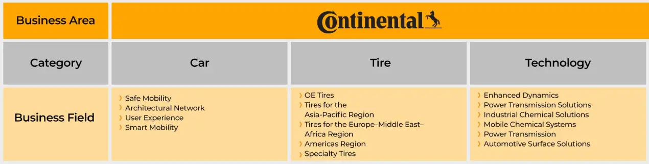 Từ ngày 1 tháng 1 năm 2022, các lĩnh vực kinh doanh Lốp và ContiTech (trước đây được hợp nhất trong nhóm Công nghệ Cao su) đã trở thành các lĩnh vực tập đoàn độc lập. Đồng thời, Continental đã tổ chức lại toàn diện lĩnh vực nhóm Công nghệ Ô tô (từ năm 2022: Ô tô) và tạo ra 5 lĩnh vực kinh doanh năng động, linh hoạt với mục tiêu trong tương lai sẽ hướng đến các lĩnh vực chiến lược và phát triển thị trường của công nghệ ô tô.